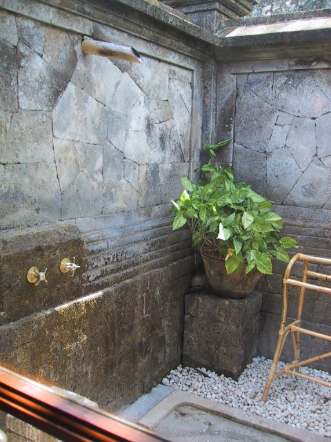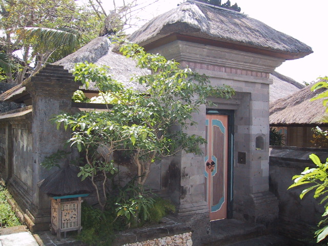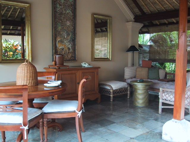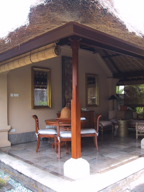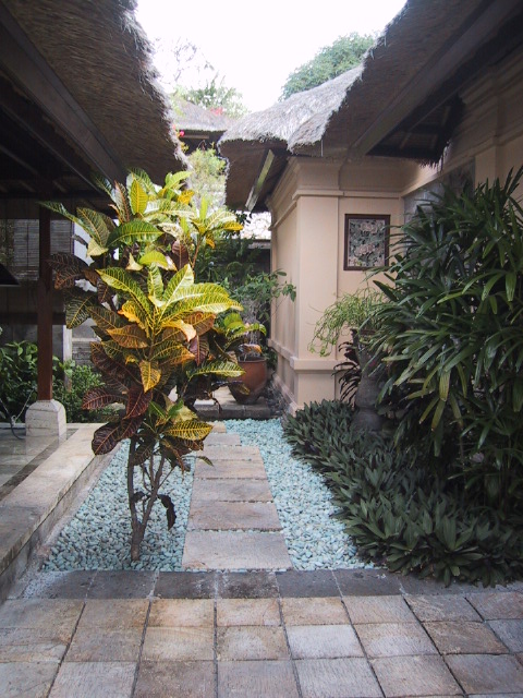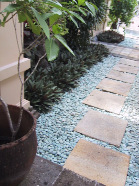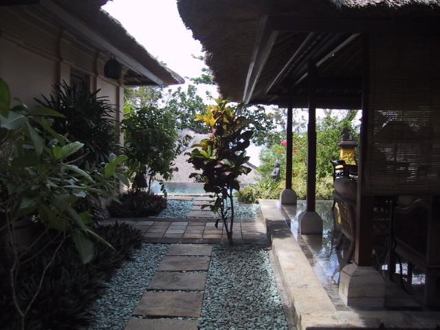 ヴィラは、門の扉を開けると石が敷かれた庭で、右手がオープンエアのダイニングとリビング、